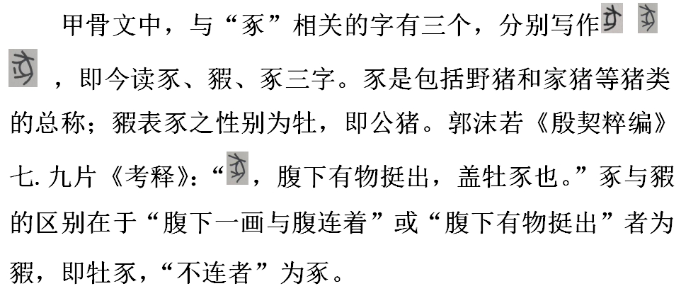 許慎《說文解字》釋“豖”:“豖,豕絆足行豖豖,從豕系二足,丑六切。”就是說,豕下一畫為系足之繩索,故釋豖為“系足之豕”。甲骨文出土后,解釋“豖”字者,聚訟甚多。一種觀點是承繼許慎之說。我國著名畜牧學家,教育家,中國現代養(yǎng)豬學奠基人之一的張仲葛,認為豕下一畫為繩索等系囚之物。他說,據甲骨文記載,“當時馴養(yǎng)野豬,必需用繩束等物系囚一時,或加牿于其頭頸等以防其逃逸。如豕字甲骨文作‘豖’。豕字的‘、’(作者注:即豕下一筆)表明是用繩束或加牿的意思。”⑦另一種觀點是大家如郭沫若、楊樹達、聞一多、于省吾、徐中舒、唐蘭、孫海波、李孝定等都自有其說。聞一多先生認為“今案(豕)腹下一畫與腹連著者為牡豕,則不連者殆即去勢之豕,因之,此字即當釋為豖。”⑧;楊樹達先生《積微居小學述林》卷二《釋豖》:“余疑豖當為豕去勢之義,今通語以為閹豬是也。”徐中舒《甲骨文字典》:“去勢之肥豕,用于祭祀。”聞、楊、徐等前輩均釋豖為“去勢之豕”,從而徹底否定了許慎的釋義。此觀點一出,立刻得到了學界的普遍認可。