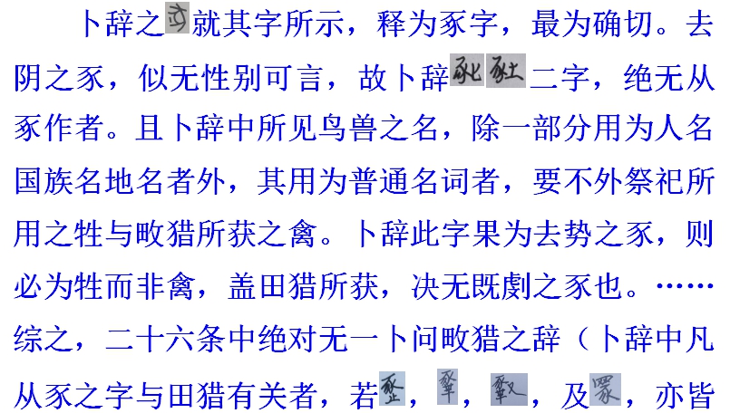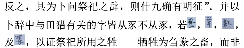 第三、“國(guó)之大事,在祀與戎”,也就是說(shuō),自古以來(lái),祭祀在中國(guó)人的生活中都是頭等大事。聞一多先生在《釋為釋豖》一文中已明確了“祭祀所用之牲”與“畋獵所獲之禽”的區(qū)別,并悉錄卜辭中出豖字者26例,指出“二十六條中絕對(duì)無(wú)一卜問(wèn)畋獵之辭。