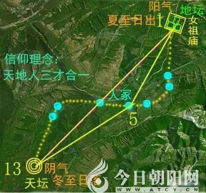 整個(gè)遺址是通過(guò)主體架構(gòu)體現(xiàn)天地人之間和諧關(guān)系的,這個(gè)主體架構(gòu)其實(shí)就是一個(gè)標(biāo)準(zhǔn)的等腰三角形。東北—西南向的天(圓)地(方)祭壇之間的連線(xiàn)就是三角形的底邊,等腰相交的頂角處是遺址最中心的屬于積石冢性質(zhì)的第五地點(diǎn),一號(hào)冢中心大墓處在立夏節(jié)北斗玉衡星的位置。以第五地點(diǎn)為代表的7個(gè)積石冢地點(diǎn)以反S形均勻地分布在天地祭壇之間的崗頂上,代表人與天地合一。圓方天地祭壇連線(xiàn)構(gòu)成東北—西南緯45度天文準(zhǔn)線(xiàn),代表夏至日出和冬至日落方位,二至代表一年的陰陽(yáng)二氣(太極兩儀)。人在陰陽(yáng)二氣之間的協(xié)調(diào)作用下可以獲得立夏時(shí)節(jié)旺盛的生命力,所以,等腰三角形主體架構(gòu)體現(xiàn)了天、地、人之間的和諧關(guān)系(圖14)。