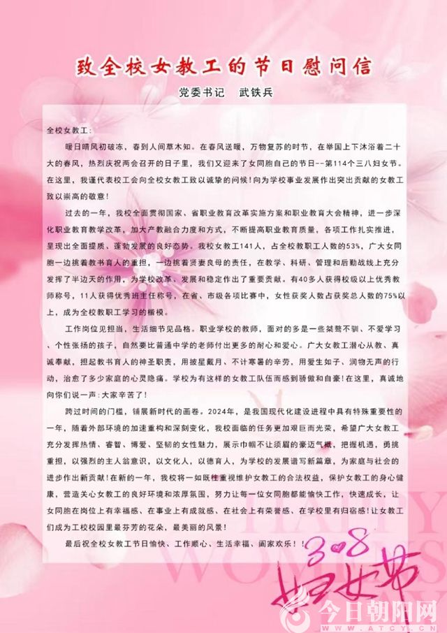 3月8日上午,武鐵兵代表學(xué)校領(lǐng)導(dǎo)班子發(fā)出了節(jié)日慰問(wèn)信,向全校女職工致以誠(chéng)摯的節(jié)日問(wèn)候,向?yàn)閷W(xué)校教育事業(yè)發(fā)展作出杰出貢獻(xiàn)的女職工們致以崇高的敬意。他表示,2024年,是我國(guó)現(xiàn)代化建設(shè)進(jìn)程中具有特殊重要性的一年,隨著外部環(huán)境的加速重構(gòu)和深刻變化,學(xué)校面臨的任務(wù)更加艱巨而光榮,希望廣大女教工繼續(xù)以巾幗不讓須眉的豪邁氣概,以文化人,以德育人,為學(xué)校發(fā)展譜寫(xiě)新篇章,為家庭與社會(huì)進(jìn)步作出新貢獻(xiàn)。
