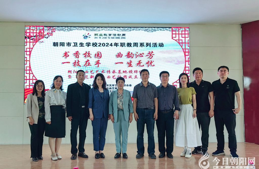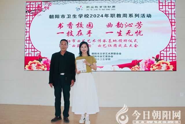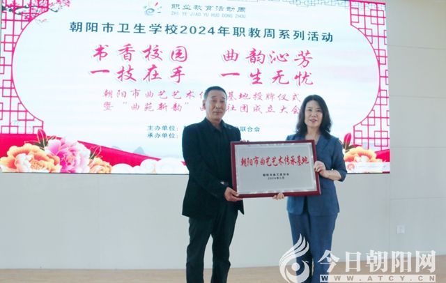 五月朝陽(yáng),繁花似錦,綠蔭如海,生機(jī)盎然。5月15日,在2024年職業(yè)教育活動(dòng)周之際,遼寧省朝陽(yáng)市曲藝藝術(shù)傳承基地授牌儀式暨“曲苑新韻”曲藝社團(tuán)成立大會(huì)在朝陽(yáng)市衛(wèi)生學(xué)校舉行。朝陽(yáng)市文聯(lián)副主席林愛(ài)華、組聯(lián)部部長(zhǎng)孫超,朝陽(yáng)市曲藝家協(xié)會(huì)主席于寶春、副主席倪杰、秘書(shū)長(zhǎng)崔鐵艷,朝陽(yáng)衛(wèi)校校長(zhǎng)劉立璽、副校長(zhǎng)郭佳出席。學(xué)校相關(guān)科室負(fù)責(zé)人及學(xué)生代表參加?;顒?dòng)由宣教科科長(zhǎng)李延華主持。