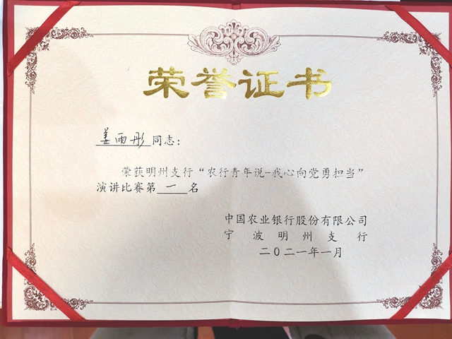 2019年大學畢業(yè)后,她進入了中國農(nóng)業(yè)銀行寧波明州支行工作。走上工作崗位的她,牢記老師對她的教導,認真對待每一項工作,踏踏實實、勤勤懇懇。擔任鄞江支行柜面經(jīng)理期間,她除了完成本職工作外,還利用業(yè)余時間撰寫多篇企業(yè)內(nèi)刊文章,并為自己與所在單位拿到通訊員、單位考核完成率第一名的好成績,她的研討文章《淺談改進農(nóng)行掌銀》被《寧波農(nóng)村金融》采用。擔任國業(yè)部外匯會計期間,她認真學習外匯業(yè)務的同時競聘了明州支行第二屆團委委員,成功入選宣傳委員,輔助團委書記及綜合部做好團委相關(guān)工作。擔任綜合管理部文秘期間,她的多篇文章被寧波市分行“青穗園”、分行內(nèi)網(wǎng)、外部媒體選用,并獲得寧波市分行優(yōu)秀小編稱號。協(xié)助工會進行行業(yè)管理,承擔女工委責任,做好全行活動組織、策劃、編輯等工作,獲得寧波市分行工會積極分子榮譽稱號。2024年4月,她由綜合管理部綜合文秘調(diào)至個人金融部產(chǎn)品經(jīng)理一職,面對新興業(yè)務她毫不退縮,較好地完成了各項目標任務。