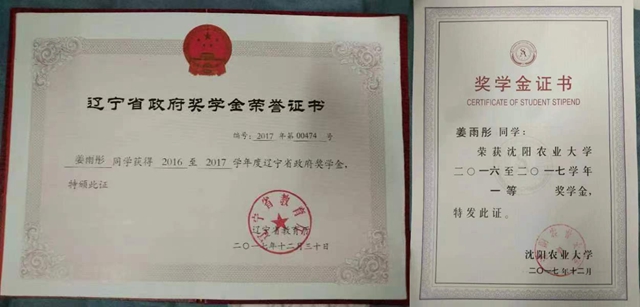 2015年,她如愿考入沈陽農(nóng)業(yè)大學生物工程專業(yè),圓了大學夢。接到錄取通知書的那一刻,她欣喜若狂,喜極而泣,三年的付出終于等到了大學伸來的橄欖枝。大學期間,她一刻也沒有放松,學習方面更加刻苦。由于大學期間成績優(yōu)異,曾榮獲遼寧省政府獎學金一次,校級一等獎學金三次、二等獎學金一次。她還積極參加學校組織的各項活動,由于出色表現(xiàn),在生物學院辯論賽中取得第三名的好成績,那個不善言辭,不愛表達的女孩在不斷的自我挑戰(zhàn)中茁壯成長。