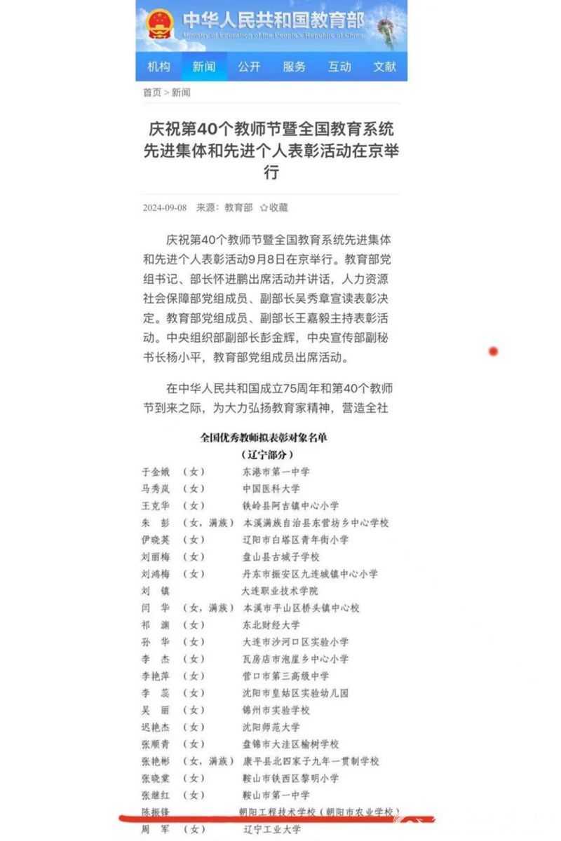 為大力弘揚教育家精神,營造全社會尊師重教濃厚氛圍,激勵全國廣大教師和教育工作者落實立德樹人根本任務(wù),積極投身教育強國建設(shè),近日,慶祝第40個教師節(jié)暨全國教育系統(tǒng)先進集體和先進個人表彰活動在京舉行?,F(xiàn)場,教育部公布了全國優(yōu)秀教師和全國優(yōu)秀教育工作者名單,遼寧省朝陽工程技術(shù)學(xué)校教師陳振鋒榜上有名,獲得全國優(yōu)秀教師榮譽稱號,成為今年朝陽市教育系統(tǒng)唯一獲此殊榮的教師。
