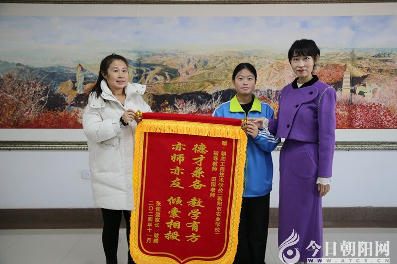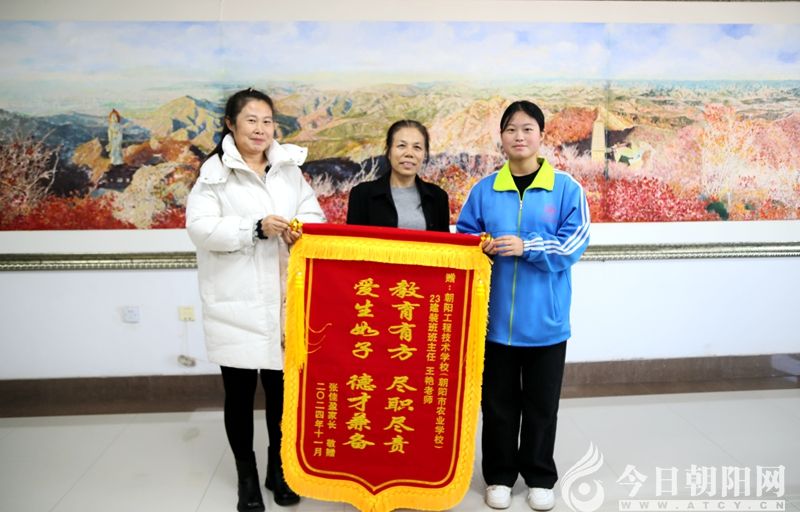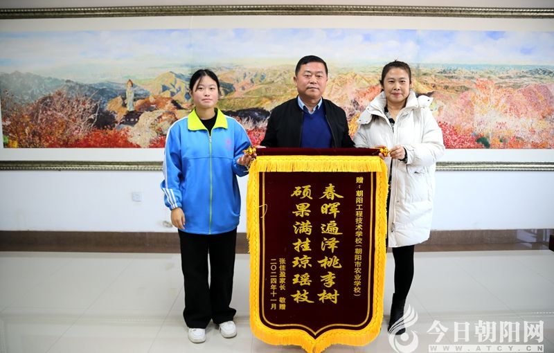 11月6日,遼寧省朝陽工程技術(shù)學(xué)校23級(jí)建筑裝飾技術(shù)專業(yè)張佳盈同學(xué)的家長滿懷著感激之情來到學(xué)校,送上分別印有“春暉遍澤桃李樹 碩果滿掛瓊瑤枝”“德才兼?zhèn)?教學(xué)有方 亦師亦友 傾囊相授”“教育有方 盡職盡責(zé) 愛生如子 德才兼?zhèn)?rdquo;字樣的三面錦旗,以此感謝學(xué)校和老師對(duì)張佳盈的辛勤培養(yǎng)。學(xué)校黨委書記楊海彬,副校長崔秀麗、馮繼軒、陳靜,教務(wù)科、學(xué)生科、建筑教學(xué)部相關(guān)負(fù)責(zé)人以及張佳盈的指導(dǎo)教師、班主任共同接受錦旗。