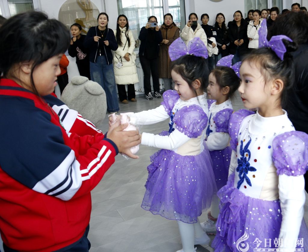 在舞蹈教室,一場別具風格、意義非凡的演出精彩開場。市教育幼兒園的教師和小白鴿藝術團的小朋友們帶來了精心編排的手勢舞《有你就幸福》、非洲鼓《上春山》等節(jié)目,表演靈動,節(jié)奏明快,營造了歡樂溫馨的氛圍。市特教中心的孩子們也用他們獨有的表演方式表達著對藝術的熱愛以及對生活的堅守,他們的演出贏得了在場觀眾的熱烈掌聲。