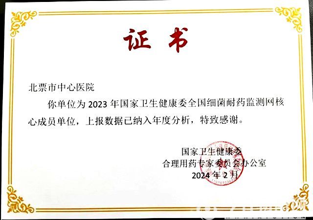 經(jīng)國家衛(wèi)生健康委合理用藥專家委員會辦公室審核,遼寧省北票市中心醫(yī)院于2024年2月被批準成為“2023年國家衛(wèi)生健康委全國細菌耐藥監(jiān)測網(wǎng)核心成員單位”,上報的數(shù)據(jù)將納入年度分析。