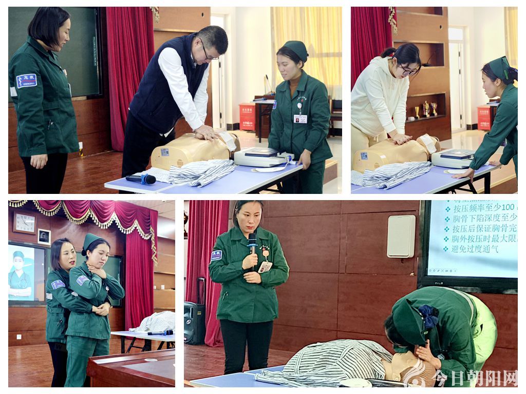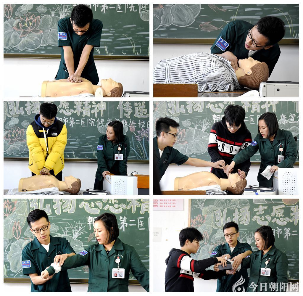 在朝陽師范學(xué)院,醫(yī)護(hù)人員用通俗易懂的語言為學(xué)生們講授了心肺復(fù)蘇的相關(guān)知識,并進(jìn)行模擬人操作示范,強調(diào)胸外按壓、放平四肢、判斷脈搏、開放氣道、人工呼吸等手法要點和規(guī)范動作。隨后,邀請學(xué)生上臺進(jìn)行模擬練習(xí),手把手教授學(xué)生每一個操作細(xì)節(jié),直至動作正確、操作成功。醫(yī)護(hù)人員還詳細(xì)介紹了常見外傷的急救技巧以及受傷后急救的關(guān)鍵步驟等,并為大家演示了各種包扎技術(shù)。