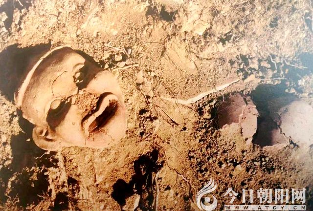 在牛河梁遺址考古工作站展室里,放著一尊復(fù)制的女神頭像,她面部為鮮紅色,顴骨突起,圓額頭,鼻梁低而短,下頦尖而圓,是典型的蒙古利亞人種。女神的眼珠用兩個晶瑩碧綠的圓玉片鑲嵌而成,顯得雙目炯炯。和女神頭像同時出土的還有6個大小不同的殘體泥塑女性裸體群像,有因年齡差異而發(fā)育不同的乳房,有圓潤的肩膀,還有完整的手臂,最小的泥塑與真人大體相近,主室中心出土的大鼻、大耳竟等于真人的3倍。