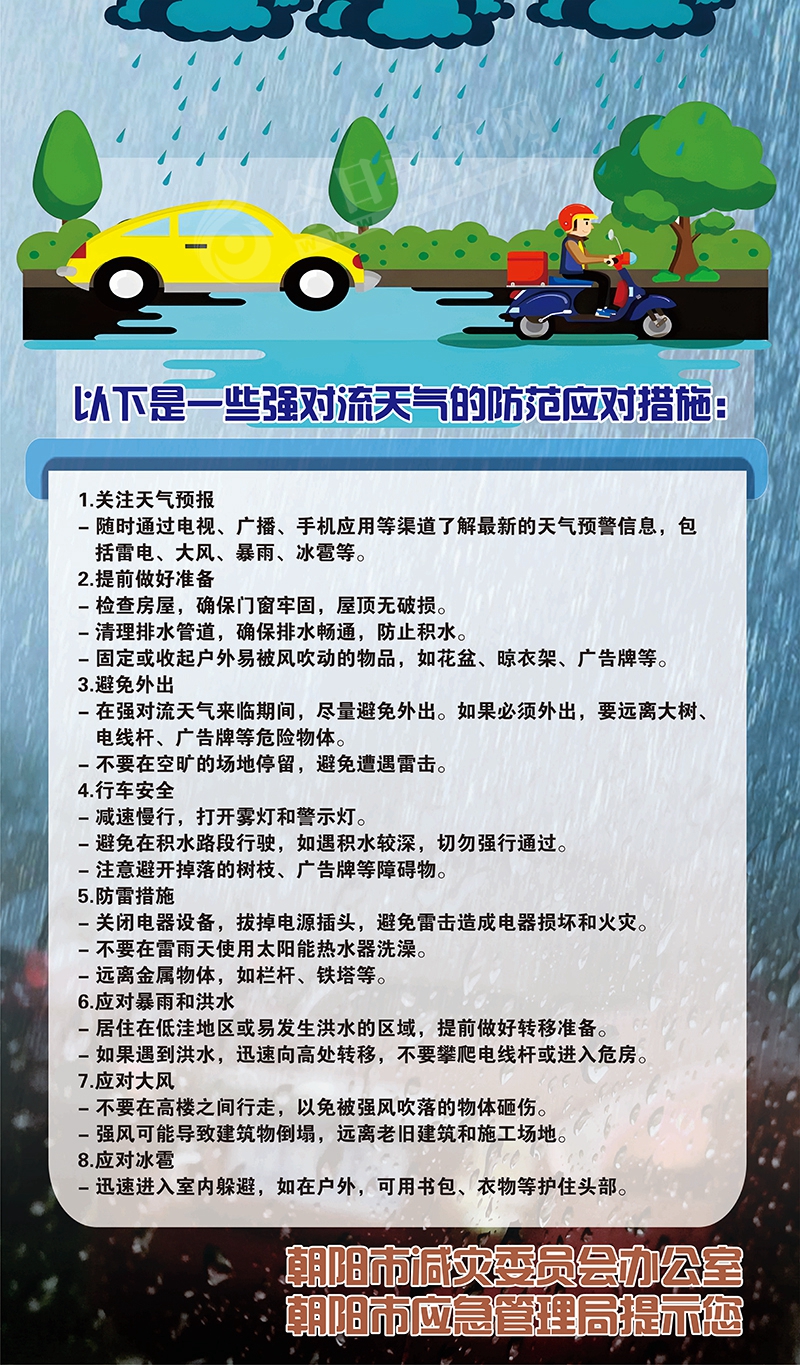 近期,遼寧省朝陽市強(qiáng)對(duì)流天氣多發(fā)。受強(qiáng)對(duì)流天氣影響,易引發(fā)城市內(nèi)澇、地質(zhì)災(zāi)害等次生災(zāi)害,且影響范圍廣,尤其對(duì)交通出行、農(nóng)業(yè)生產(chǎn)等產(chǎn)生較大影響。朝陽市減災(zāi)委員會(huì)辦公室、朝陽市應(yīng)急管理局溫馨提示廣大市民:及時(shí)關(guān)注天氣預(yù)警信息,如遇強(qiáng)對(duì)流天氣,請(qǐng)減少戶外作業(yè)和活動(dòng),進(jìn)入安全場(chǎng)所,關(guān)閉門窗,遠(yuǎn)離電源。