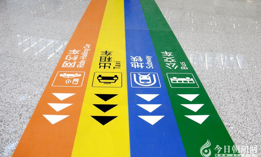 掃描身份證出閘機(jī)后,就能夠看到“朝陽交通樞紐”導(dǎo)向牌。隨后,按照地面彩虹標(biāo)識繼續(xù)向前走,深藍(lán)色為地鐵方向。一直直行,地鐵站進(jìn)站口就在左側(cè),全程約10分鐘。