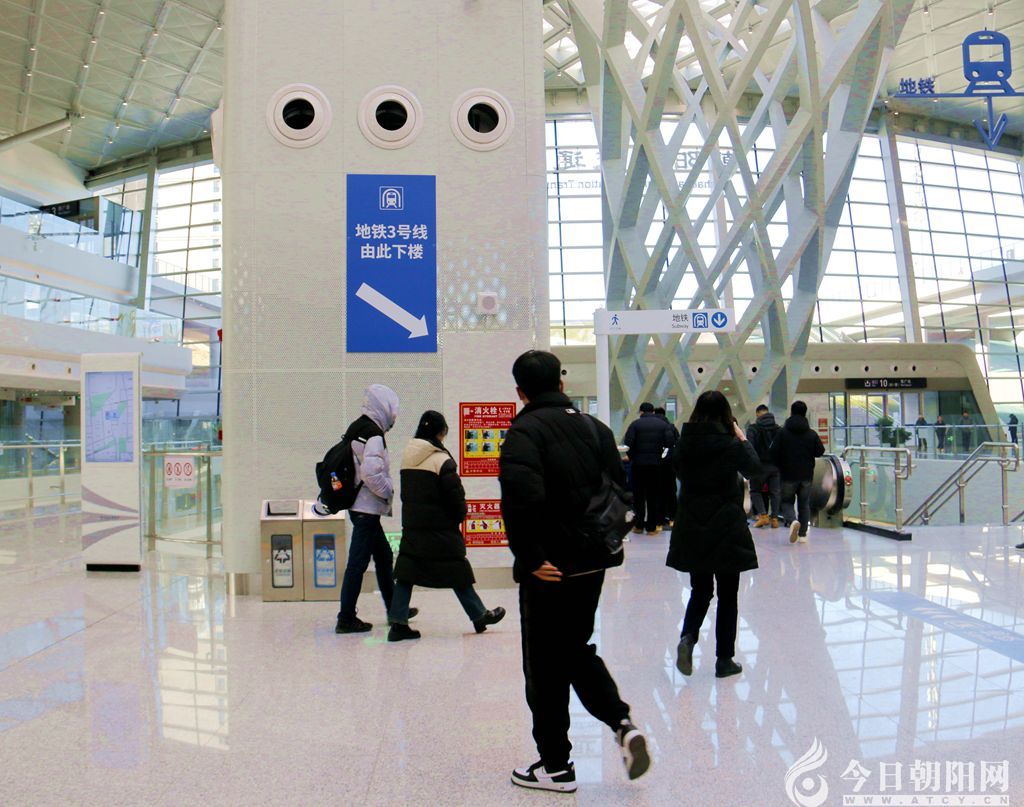 在地鐵3號線的朝陽站下車,乘坐扶梯上樓,將地鐵卡投入到閘機(jī)里即可出站。出站后,繼續(xù)搭乘扶梯上樓,看到“鐵路出發(fā)”導(dǎo)向牌,即可順利進(jìn)入高鐵站。
