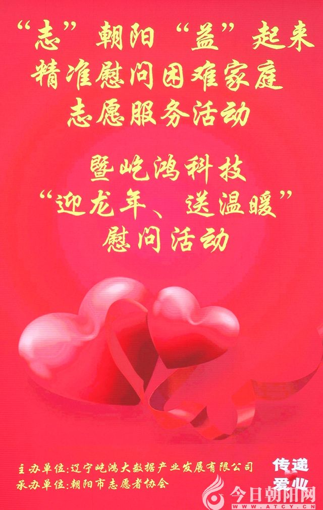 2月5日,遼寧朝陽(yáng)朔風(fēng)凜冽、天寒地凍,在朝陽(yáng)數(shù)字信息產(chǎn)業(yè)園卻演繹著暖心的一幕。由遼寧屹鴻大數(shù)據(jù)產(chǎn)業(yè)發(fā)展有限公司主辦,朝陽(yáng)市志愿者協(xié)會(huì)承辦的“‘志’朝陽(yáng) ‘益’起來(lái)”系列志愿服務(wù)之精準(zhǔn)慰問(wèn)困難家庭志愿服務(wù)活動(dòng)暨屹鴻科技“迎龍年、送溫暖”慰問(wèn)活動(dòng)如期開(kāi)展。朝陽(yáng)市社會(huì)組織管理局局長(zhǎng)陳曦,朝陽(yáng)市志愿者協(xié)會(huì)班子成員、部分會(huì)員,遼寧屹鴻大數(shù)據(jù)產(chǎn)業(yè)發(fā)展有限公司全體員工齊聚一堂,共同見(jiàn)證了這一慈善活動(dòng)的啟動(dòng)。