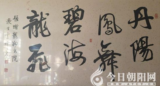 仲元老十分關(guān)心朝陽書法創(chuàng)作的研究與文化傳承,不顧年邁,多次來朝陽考察指導(dǎo)。曾受邀參加朝陽文化周,蒞臨龍翔書院大講堂,會晤朝陽書法家。龍翔書院院長秦朝暉告訴我,曾經(jīng)有幸得到過先生的一幅墨寶:寫得是“丹陽鳳舞,碧海龍飛”。此幅書法已經(jīng)成為秦院長的鎮(zhèn)院之寶了,每次去書院他都會拿出來,讓我們欣賞一番。在朝陽,喜歡仲元老書法的人很多,都以能得到一幅仲元老的作品為收藏之大幸。