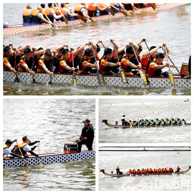 10日11時35分,龍舟賽在觀眾的翹首以待中開始。率先進行的是機關(guān)事業(yè)組、企業(yè)組100米、 200米直道競速預(yù)賽?,F(xiàn)場,鼓聲雷動,龍舟齊發(fā),爭先恐后。只見水面上,參賽隊員精神抖擻,奮勇?lián)]漿,一支支船漿飛快地劃過水面,大家顧不得擦去臉上的汗珠和噴濺的水花。龍舟上的擊鼓人員更是無比興奮,雙槌齊下,恨不得用上全身的力氣來助興。再看岸邊,正值高考結(jié)束,許多考生也前來觀賽,他們和觀眾一起扯著嗓子為參賽隊員吶喊助威。一時間,鼓聲、水聲、歡呼聲交織在一起,奏出一首美妙、和諧、歡快的樂曲。