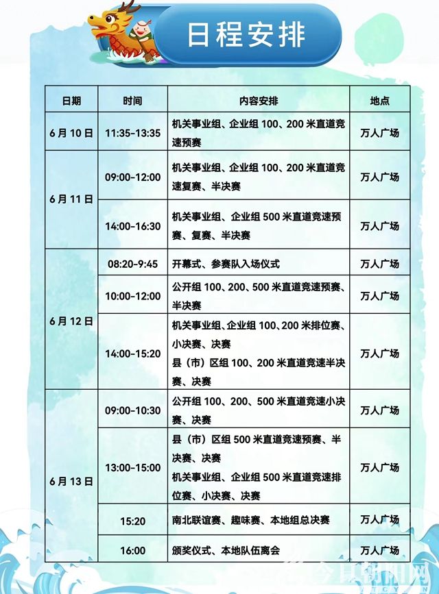 接下來幾日的賽程也是精彩而又激烈的。12日,將會在大凌河萬人廣場舉辦本屆大賽的開幕式,屆時舞龍舞獅、熱場演出和水上飛人等節(jié)目,定會為觀眾帶來一場精彩的龍舟盛宴。當(dāng)天,還將設(shè)置龍舟文化展示長廊、非遺產(chǎn)品展示展銷、龍舟新器材體驗等文化交流活動。13日晚上的“夜龍游凌河”活動,更是為觀眾打造獨特的文化盛宴。