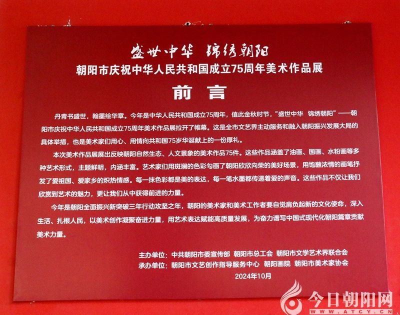 今年是中華人民共和國成立75周年。此次美術(shù)展是全市文藝界積極主動服務(wù)并融入朝陽振興發(fā)展大局的生動實(shí)踐,更是美術(shù)家們滿懷深情向共和國華誕獻(xiàn)上的珍貴禮物。