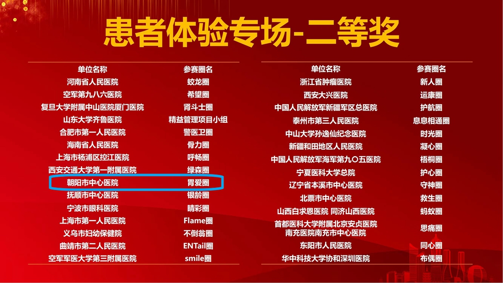 為進(jìn)一步推動(dòng)醫(yī)院管理工具在全國(guó)醫(yī)療機(jī)構(gòu)的深入開展,10月31日至11月3日,由國(guó)家衛(wèi)生健康委員會(huì)醫(yī)政司指導(dǎo),清華大學(xué)醫(yī)院管理研究院主辦,浙江省醫(yī)院協(xié)會(huì)承辦的第十二屆全國(guó)醫(yī)院管理工具大會(huì)在浙江杭州舉行。本次大會(huì)決賽入圍項(xiàng)目共1740項(xiàng)。大賽設(shè)置了課題研究型專場(chǎng)、三級(jí)醫(yī)療醫(yī)技專場(chǎng)、三級(jí)醫(yī)院護(hù)理專場(chǎng)、基層醫(yī)院專場(chǎng)、三級(jí)行政后勤專場(chǎng)、首次參賽醫(yī)院專場(chǎng)、藥事藥物專場(chǎng)、QFD創(chuàng)新型品管圈專場(chǎng)、平衡計(jì)分卡專場(chǎng)、臨床路徑專場(chǎng)、HFMEA與RCA專場(chǎng)、精益六西格瑪專場(chǎng)、6S專場(chǎng)、患者體驗(yàn)與安全專場(chǎng)共14個(gè)專場(chǎng)。經(jīng)過激烈角逐,朝陽(yáng)市中心醫(yī)院參賽的兩個(gè)圈組表現(xiàn)優(yōu)異,“JF圈”榮獲三級(jí)醫(yī)院“行政后勤專場(chǎng)”二等獎(jiǎng)、“胃愛圈”榮獲三級(jí)醫(yī)院“患者體驗(yàn)與安全專場(chǎng)”二等獎(jiǎng)。