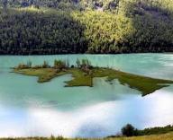 臥龍灣位于喀納斯河三個河灣的最下游。因河灣內(nèi)的湖心島猶如一條蛟龍盤臥嬉水而得名。相傳很久以前,一條巨龍騰云駕霧在此戲水,忽然天氣突變,龍未能飛走臥于此灣,臥龍灣由此得名。臥龍灣草木蔥蘢,水鳥成群。河灣兩側(cè)是半島狀開闊平坦的大草坪,野花遍布,牛羊覓草,一派生機勃勃的景象。