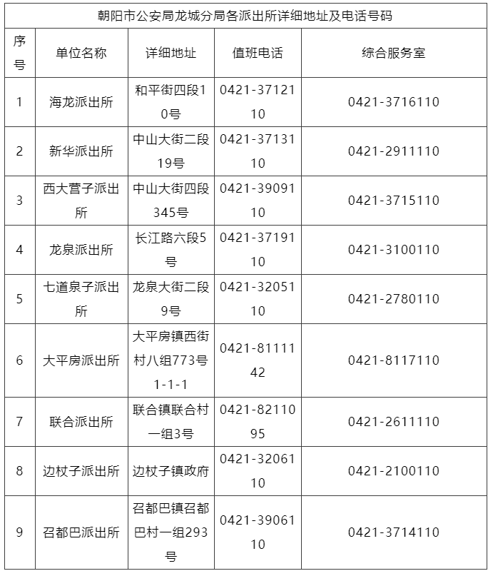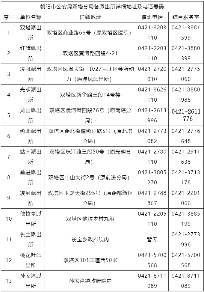摘要:雙塔分局、龍城分局各派出所辦公地址及電話公布 速轉(zhuǎn)!朝陽市公安局雙塔分局、龍城分局各派出所辦公地址及電話公布 現(xiàn)將遼寧省朝陽市雙塔分局、龍城分局各派出所辦公地址及電話公布如下: 來源:平安朝陽 朝陽市公安局雙塔、龍城分局同日揭牌 開啟公安工作嶄新篇章 [編輯 立軍] 【本網(wǎng)聲明】