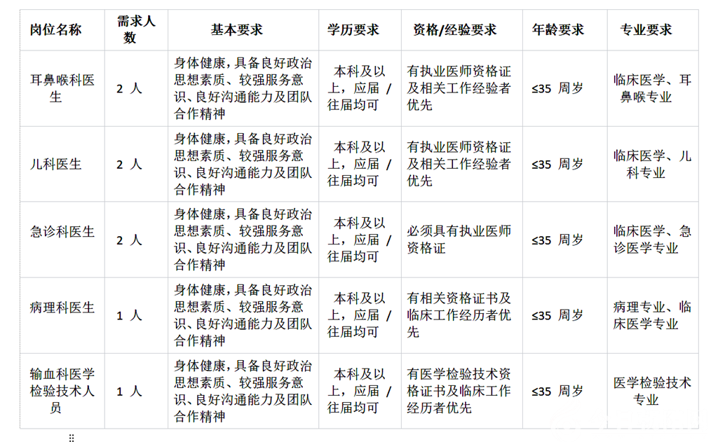 薪酬待遇:耳鼻喉科、兒科、急診科、病理科崗位人員享受事業(yè)編工資;輸血科崗位人員享受聘任合同制工資;績(jī)效工資按所在科室規(guī)定發(fā)放。