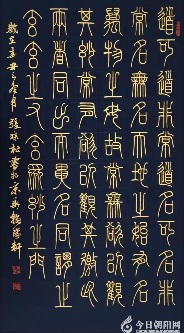 張琮松的篆書,高古渾勁,博采眾長。他主要汲取了李斯玉箸篆的圓潤流暢、線條勻凈;李陽冰鐵線篆的挺拔剛勁、婉轉(zhuǎn)通神;以及鄧石如篆書的雄渾大氣、古樸典雅。觀其篆書作品,線條婉轉(zhuǎn)自如,如屈鐵盤絲,在規(guī)整之中蘊(yùn)含靈動變化;結(jié)體嚴(yán)謹(jǐn)端莊,卻又不失舒展之態(tài),盡顯古雅之韻。每一筆都仿佛穿越時空,帶著歷史的厚重與文化的深邃,讓人在欣賞之際,領(lǐng)略到篆書獨(dú)特的藝術(shù)魅力與文化內(nèi)涵。