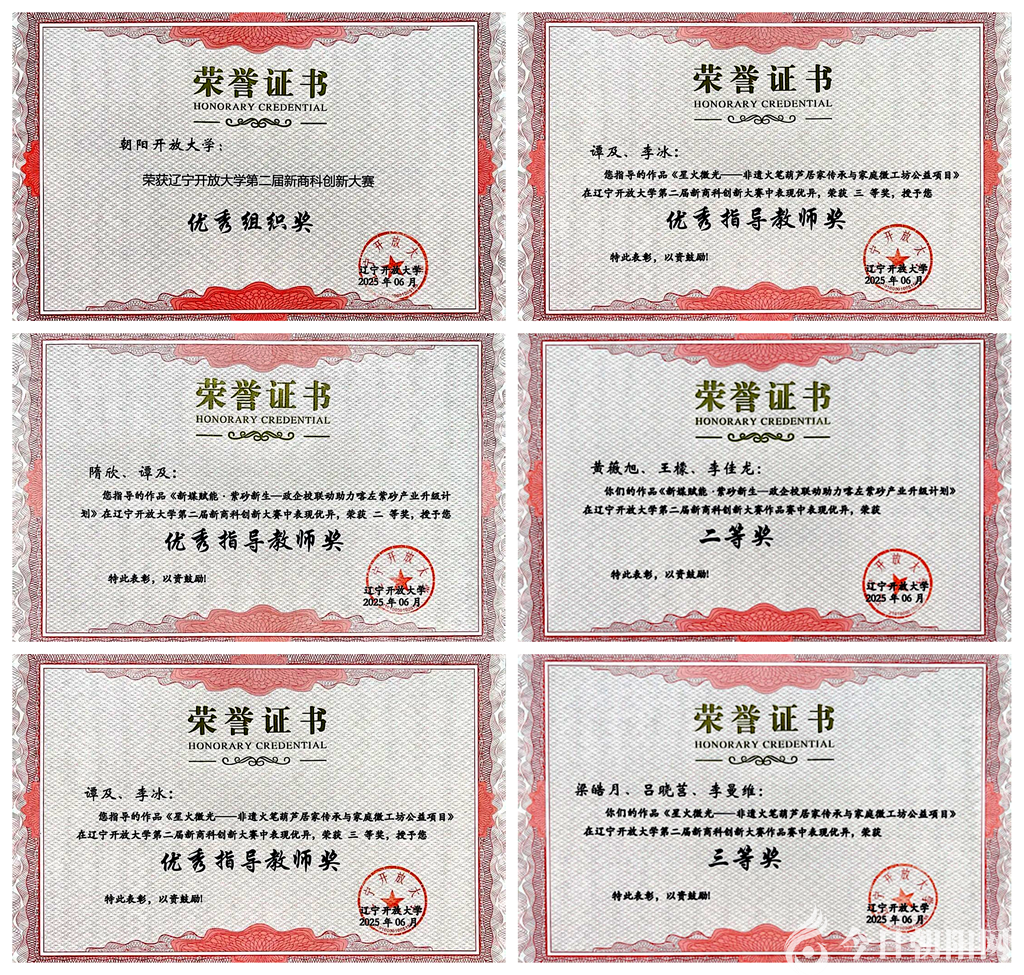 在遼寧開(kāi)放大學(xué)第二屆新商科創(chuàng)新大賽中,朝陽(yáng)開(kāi)放大學(xué)師生團(tuán)隊(duì)展現(xiàn)了出色的創(chuàng)新思維與實(shí)踐能力。由隋欣、譚及等老師指導(dǎo)的學(xué)生團(tuán)隊(duì)作品《新媒賦能·紫砂新生》榮獲二等獎(jiǎng),《星火微光》榮獲三等獎(jiǎng)。隋欣、譚及、李冰老師獲“優(yōu)秀指導(dǎo)教師獎(jiǎng)”,學(xué)校獲“優(yōu)秀組織獎(jiǎng)”。這些成績(jī)彰顯了學(xué)校在應(yīng)用型人才培養(yǎng)、服務(wù)地方產(chǎn)業(yè)發(fā)展方面的積極探索與實(shí)力。