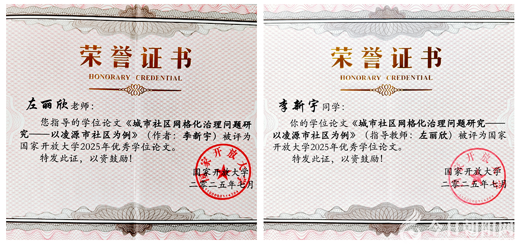 捷報(bào)接連不斷,在國(guó)家開(kāi)放大學(xué)2025年優(yōu)秀學(xué)位論文評(píng)選中,由左麗欣老師指導(dǎo)的學(xué)員李新宇的論文《城市社區(qū)網(wǎng)格化治理問(wèn)題研究》獲評(píng)“優(yōu)秀學(xué)位論文”,此次全國(guó)僅評(píng)選172篇,遼寧開(kāi)大系統(tǒng)僅3篇入選,含金量十足。