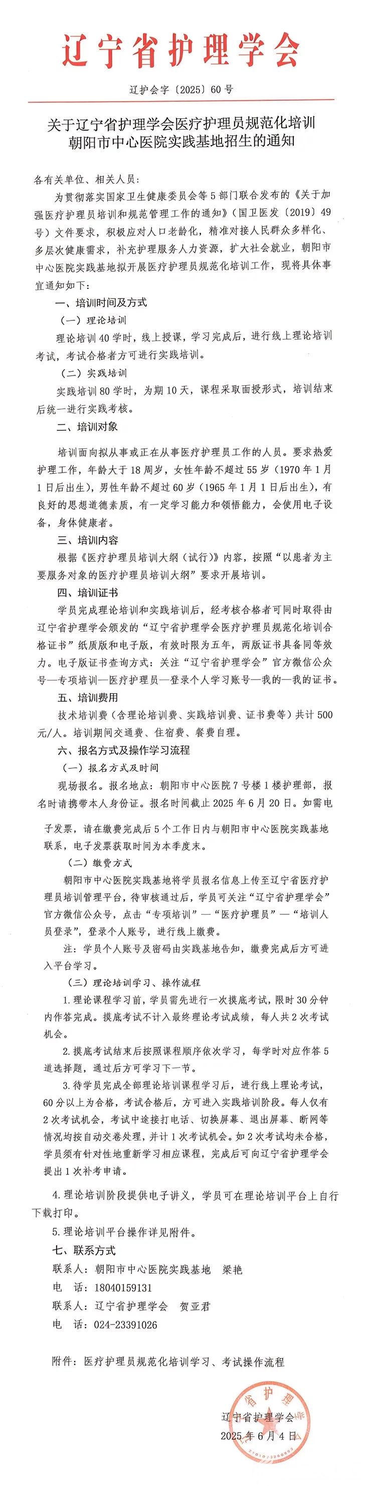遼寧省護理學會醫(yī)療護理員規(guī)范化培訓朝陽市中心醫(yī)院實踐基地,現面向社會公開招收擬參加醫(yī)療護理員規(guī)范化培訓的人員(第二期),報名時間截止到2025年6月20日。具體事宜見《關于遼寧省護理學會醫(yī)療護理員規(guī)范化培訓朝陽市中心醫(yī)院實踐基地招生的通知》(遼護會字〔2025〕60號)文件,如下: