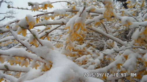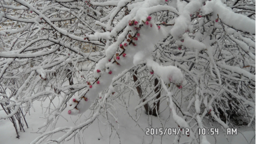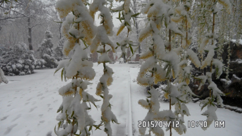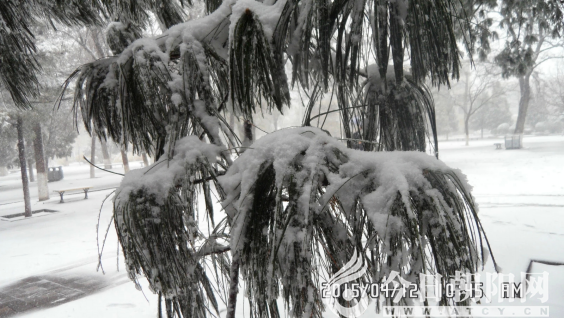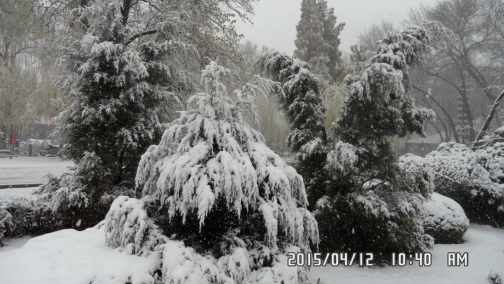 大吉羊年,瑞雪翩然。時值四月,春雪盈天。柳綠花紅,百色纏綿。六出忽至,滿目斑斕。山披瓊衣,水抖貂顏。綠葉涂膏,紅朵裹棉。槐登白履,松戴銀冠。新草卓綠,嫩枝不喧。粉面泛春,香腮凝寒。玉堆墻角,霜染屋檐。真乃:黃蕊羞掀晶瑩被,紅杏難掩蓋頭簾。原本蜂飛蝶舞日,萬物皆唱梨花篇。
