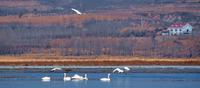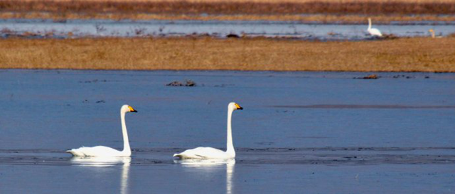 遼寧北票下府濕地面積無法目測,隨便站一個地方,譬如在一片波光爍爍的涂灘,你舉目吧,視野之內(nèi)水泊連綿,宛若上帝把一片一片水像補丁一樣連綴一起。你會為濕地開闊和水光瀲滟震驚。沒想到遼西北票還有這么大的一塊濕地。更沒想到的是此地方圓數(shù)十公里的水域里,埋伏下龐大的天鵝隊伍。像白云乘興按落云頭,像水邊囤積著大量棉花堆,耀眼。