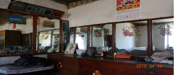 東山腳下,一戶六旬開外的苗姓村民家里,草料棚,牲畜圈,養(yǎng)著兩大一小長耳朵毛驢。院門一側(cè)拴著只小黃狗,兩只小眼睛黑葡萄似的,見有生人進來便“汪、汪”撒著歡地咬。土房山墻脊泥巴裂開了縫隙,房頂壓了一層石棉瓦,檐下掛著鋤頭、耙子等農(nóng)具。屋里拾掇的利整,縫紉機、掛鐘這些老物件還在沿用著。擦得一塵不染的老式箱柜上,立著一排墻鏡,兩側(cè)條鏡草書毛體黑字對聯(lián),其中一副是:“春風(fēng)楊柳萬千條,六億神州盡舜堯。”鏡框顏色有些晦暗,邊緣夾著兩排孫男弟女照片。女主人介紹,兒女都在溝外大的地方打工生活,只在年節(jié)帶了孫子孫女們回來,平時偌大家里就剩老兩口,村里其他人家也大抵如此,最興旺時,村里有三十五戶人家三百四五十口,現(xiàn)在就剩下十多戶二三十口,而且都是五十歲以上的老人。主人說的平和,倒看不出心緒有幾多惆悵。傳統(tǒng)意義上的家園正在遭遇現(xiàn)代文明的誘惑和挑戰(zhàn),即便眼下有一批如苗氏老人們堅如磐石的虔誠守望,又有誰敢保證不會有一天,承載我們精神和靈魂的棲息地將無處尋覓呢?!