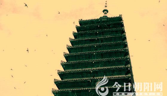 燕都的燕子多為雨燕。雨燕,也叫北京雨燕,在我們老家都叫山燕子。比家燕體形稍大,羽毛呈黑褐色,胸腹部有白色細(xì)縱紋。雨燕兩翅特長(zhǎng),尾翼短小,爪子弱小,四趾朝前,只靠尖爪攀附在陡直的立面上,這也就決定了雨燕必須是飛翔的,不能停歇。像《阿飛正傳》里所說的無腳大鳥,永遠(yuǎn)漂浮在空中,一旦落地就再也不能飛翔。雨燕飛行時(shí),兩翼扇動(dòng)比較慢,但因身體呈流線型,飛行速度也極快。雨燕飛行時(shí)都是成群結(jié)隊(duì)的,驚聲尖叫著,翻轉(zhuǎn),盤旋,像是快樂的云團(tuán)。在我們老家,大人訓(xùn)斥鬧騰的孩子都說像山燕子一樣嘰嘰喳喳。雨燕喜好在樓閣、廟宇、亭榭等高大古建筑的椽間、墻洞、縫隙中營(yíng)巢,巢為淺盤狀,由干草、紙屑混以唾液黏合而成,大都是隱蔽的。所以這也就是燕都的廟宇、塔寺多燕子的原因,朝陽的南北二塔原來都有雨燕居住,只不過在修繕的過程中,只有南塔保留了眾多的雨燕巢穴,所以“寶塔金燕”的美景才得以保留。每當(dāng)黃昏時(shí),成千上萬的雨燕在塔身周圍上下翻騰,驚叫連連,每一只雨燕都被染上金色,形成巨大的金色的光束、波浪和震蕩波,在城市的上空傳遞著快樂的訊息。