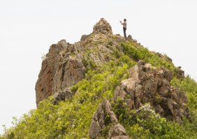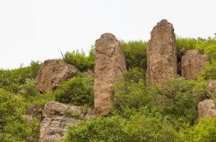 如果說(shuō)這個(gè)隨和的人也有一點(diǎn)個(gè)性的話,那就是滿山的石頭都棱角分明,有棱有面而且各顯其美。這些石頭樣子突兀,造型千奇百怪,有的像雄獅端坐,有的似門扉虛掩,有的如石筍直立。還有像馬鞍子,頭盔,盾牌的……那些石頭在渾圓的山中很顯眼,這些怪模怪樣的石頭讓人想象和感嘆。石頭大小不一,有大如房屋的巨石橫梗在面前,也有腳下隔隔生生的若干碎石,但石頭無(wú)論大小,統(tǒng)統(tǒng)都是有棱有面的樣子,在這里甚至找不到一枚近似于鵝卵石一樣的石子。身邊的每一塊大石頭,你都可以在上面四平八穩(wěn)地或坐或躺,因?yàn)檫@些石頭的表面多半都平整光滑。山的渾圓和石頭的棱角分明相呼相應(yīng),就像一對(duì)性格互補(bǔ)的夫妻,看著和諧,美滿。