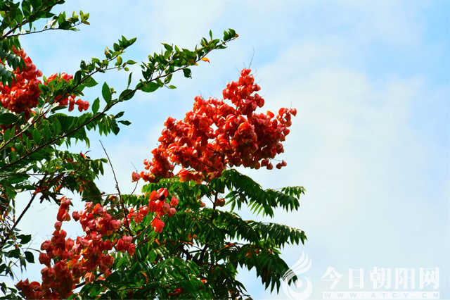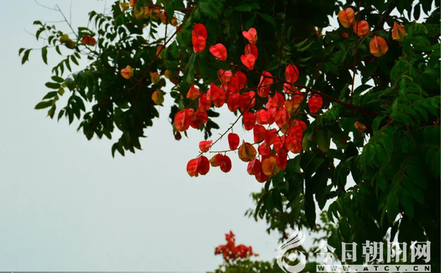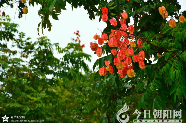 我愛(ài)欒樹!形象地說(shuō),愛(ài)它的蒴果,在秋風(fēng)掃落葉的季節(jié),依然紅艷艷地綻開靜美的生命之花,像一串串燈籠一樣掛在秋之杪,如碧海云天縹緲著絢麗的紅霞。那種美,不是春光勝似春光,無(wú)以言狀!