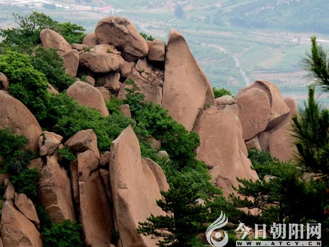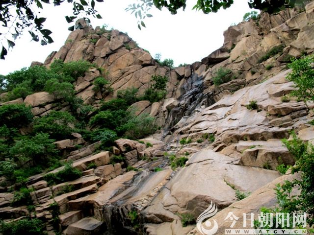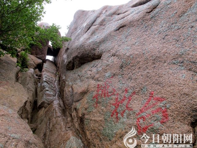 為了尋找賦有傳奇色彩的梳妝臺和馬蹄窩,我們就沿著指示牌一路走。山路狹窄,上上下下的,有的地方還必須借助旁邊的樹枝椏和山石才能通過。小虹螺山的美,美就美在滿山珠璣,美就美在一步一景,景景相連。飛龍瀑的三疊泉,范道洞,天狗望月,石猴,鸚鵡峰;群山蒼翠,千姿百態(tài),美不勝收??!都讓人欲罷不能,因?yàn)橐环蒹@喜就在前面等著。經(jīng)過了觀景臺和大風(fēng)口,我們漸漸地走近了梳妝臺。梳妝臺下,有一座三丈二尺多高的一線天梯,最窄處一個人勉強(qiáng)通過,我戰(zhàn)戰(zhàn)兢兢跟著文友們往上爬。爬到一半時,往下一看,嚇得腿軟了。想下去還下不去,抬頭看上面,心突突地,還上不去了。這時候,上面的人就拉著我的手,下面的一個游客幫忙托著我的腳,費(fèi)勁巴力把我弄上去了。站在梳妝臺上,因?yàn)閯偛诺木壒剩乙魂囇?,幸虧后面的文友把我扶住,讓我在石頭上坐下來。稍作調(diào)整,心情豁然開朗起來。極目遠(yuǎn)望,村莊、城市和大海等都盡收眼底。山風(fēng)跟我悄悄地耳語,似乎告訴我當(dāng)年大遼蕭太后躍馬東征來到此地。傳說中的馬蹄踏痕,就是我眼前的那兩條褐色長條石頂端的馬蹄窩窩。它給我此次小虹螺山之行留下了最深的印象,讓我把它定格在我的相機(jī)里,定格在我的腦海里。