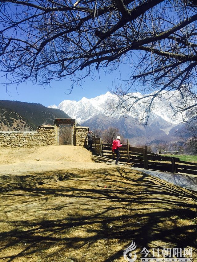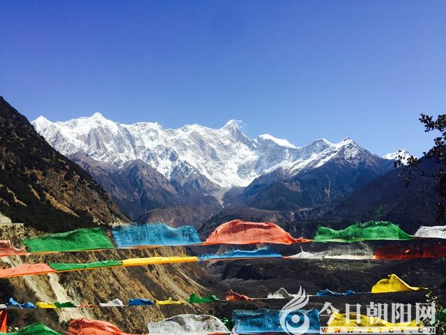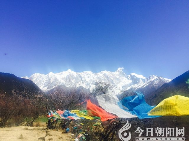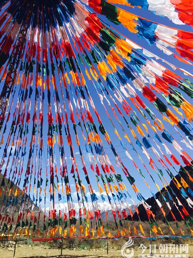 遠(yuǎn)處的一個(gè)山坡,五彩的經(jīng)幡顯得格外絢麗。在經(jīng)幡前,我張開雙臂,去擁抱世間的吉祥與如意。天上的白云也像我一樣,親吻著遠(yuǎn)方圣潔的雪山。