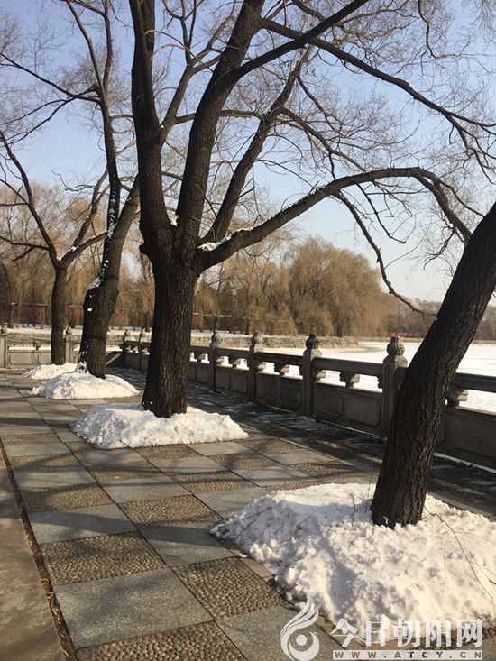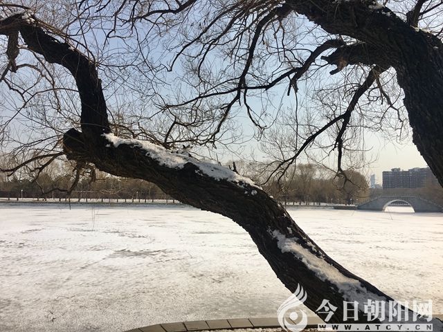 我沿濱湖路從西上橋,直走到東,又從東走回來(lái)。橋上雪已殘,很明顯是人工除雪的痕跡,然而山石樹木還掛著雪,風(fēng)一吹,稀稀落落而下,很是招搖,湖面積雪很厚,陽(yáng)光照射下,閃閃發(fā)光,很有清亮亮的感覺。