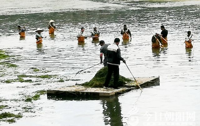 穿著皮衩,在齊腹深的水中,割除蔓延的水草,站在筏子上的要用叉子或長柄大笊籬把雜草污物撈上來。運到岸邊,裝車拉走。這些水中勞動的人上半截曬著,下半截冰著,臂膊流汗,腿腳冰涼。